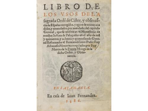1586. LIBRO. (ÓRDENES RELIGIOSAS). LIBRO DE LOS USOS DE LA SAGRADA ORDE[N] DE CISTER, Y OBSERVANCIA DE ESPAÑA CORREGIDOS Y AGORA DE NUEVO AÑADIDOS... Salamanca: Iuan Fernandez, 1586. 8º menor. 32 h. + 240 fol. + 4 h. Texto a dos tintas en las primeras hojas. Corto de márgenes, afecta el grabado xilográfico a plena página en el verso de la portada. Enc. en pergamino de época. CCPB 15555-1. Palau no da noticia de esta edición.