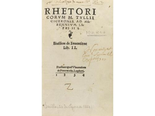 1534. LIBRO. (RETÓRICA CLÁSICA). RHETORICORUM... AD HERENNIUM. Lugduni: Apud Vincentium de Portonariis, 1534. 8º menor. 268 p. + 2 h, una con el colofón en recto y la siguiente con el grabado tipográfico del impresor en verso. Capitales xilográficas. Antiguas anotaciones manuscritas y subrayados. Finas galerías restauradas en las últimas hh. Enc. en pergamino de época, algo mareado.