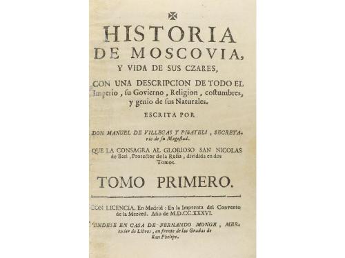 1736. LIBRO. (HISTORIA). HISTORIA DE MOSCOVIA, Y VIDA DE SUS CZARES, CON UNA DESCRIPCION DEL TODO EL IMPERIO, SU GOVIERNO, RELIGION, COSTUMBRES Y GENIO DE SUS NATURALES. Madrid: Imp. Convento de la Merced, 1736. 2 vol. en 8º mayor. 16 p. + 608 p. Dos tomos enc. en un vol., el segundo con portada propia, continúa la paginación del primero. Cabeceras, capitales y culs-de-lampe xilografiados. Texto a dos columnas. Restauración marginal en la portada, algún leve cerco de humedad. Enc. en un vol. en pergamino reciente, lomera rotulada.