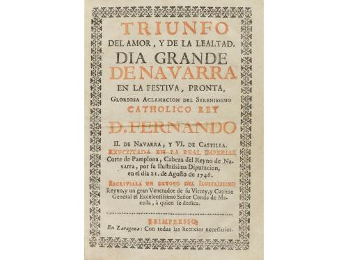 1748 ca. LIBRO. (NAVARRA). TRIUNFO DEL AMOR, Y DE LA LEALTAD. DIA GRANDE DE NAVARRA, EN LA FESTIVA, PRONTA GLORIOSA ACLAMACION DEL SERENISSIMO CATHOLICO REY D. FERNANDO. Zaragoza: reimpreso con todas las licencias, s.a. 8º mayor. 6 h. + 68 p. Cabeceras y capitales xilográficas. Portada en orla xilográfica y a dos tintas. Enc. en media piel reciente, tejuelo en el plano anterior.