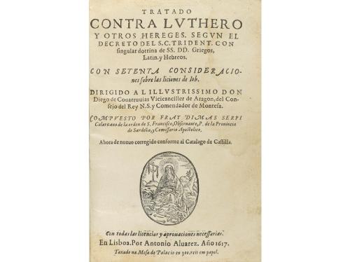 1617. LIBRO. (RELIGIÓN). TRATADO CONTRA LUTHERO Y OTROS HEREGES. SEGUN EL DECRETO DEL S. C. TRIDENT. CON SINGULAR DOTRINA DE SS. DD. GRIEGOS, LATIN. Y HEBREOS. Lisboa: Antonio Alvarez, 1617. 8º mayor. 8 h. + 266 fol. Bonita capital xilográfica. Es un tratado del purgatorio y la defensa de esta doctrina católica. Palau 309770.[Sigue:] TRATADO DE CONSIDERACIONES ESPIRITUALES, SOBRE LAS LICIONES DEL OFICIO DE DIFUNTOS. Id. Portada + 100 fol. 29 h. Errores de foliación. Texto a dos columnas. Finas galerías marginales en los dos tratados y algún leve cerco humedad. Enc. juntos en un vol. en pergamino de época. Antiguas anotaciones en las hojas de guardas.