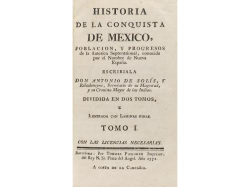 1771. LIBRO. (HITORIA- MEXICO). HISTORIA DE LA CONQUISTA DE MEXICO, POBLACION, Y PROGRESOS DE LA AMERICA SEPTENTRIONAL, CONOCIDA POR EL NOMBRE DE NUEVA ESPAÑA. Barcelona: Imp. Thomas Piferrer, 1771. 2 vol. 8º menor. I: 12 h.+ 479 p. + 6 lám. grabadas, 4 están plegadas (una de ellas es mapa). II: 6 h. + 488 p. + 2 lám. grabadas plegadas; recorte en el margen de las pp. 94 y 95, afecta levemente el texto. Cabeceras y capitales xilografiadas. Dos vol. enc. en plena piel, cortes pintados, planos y cantos rozados.