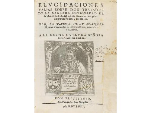 1624. LIBRO. (CARMELITAS). ELUCIDACIONES VARIAS SOBRE DOS TRATADOS DE LA SAGRADA ANTIGUEDAD DE LA ORDEN DE N. S. DEL MONTE CARMELO: COLEGIDAS DE GRAVES PADRES DOCTORES. Madrid: Juan Gonçalez, 1624. 8º mayor. 6 h. + 190 fol. + 2 h. de tablas. Grabado calcográfico en la portada que es el retrato del rey Enrique IV de Francia, firmado por Dieg[o] Al[onso] de Navas. Remarginación en los primeros fol., sin afectar el texto. Marca manuscrita de antiguo propietario en la portada. Sombra de óxido marginal. Enc. en pergamino de época, cortes pintados, lomera rotulada. CCPB 38659-6. Palau 276596. Trata de la antigüedad de la orden del Carmen.