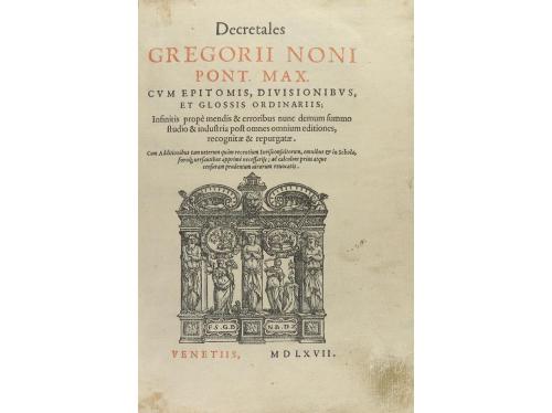 1567. LIBRO. (HUMANIDADES). DECRETALES... CUM EPITOMIS, DIVISIONIBUS, ET GLOSSIS ORDINARIIS. Venetiis: [Francesco de Franceschi, Gaspare Bindoni, Nicolò Bevilacqua, Damiano Zenaro], 1567. 4º. 34 h. + 1151 p. y dos lám. xilográficas. Portada y todo el texto a dos tintas, texto a dos columnas y alrededor los comentarios, también a dos columnas y en una tipografía menor. Apostillas marginales. Capitales xilográficas. Alguna finísima galería marginal y levísima sombra de humedad muy puntual. Enc. en plena piel, nervios, hierros dorados en ambos planos, tejuelo, rozaduras y alguna leve rasgadura en el lomo, por lo grueso del volumen.