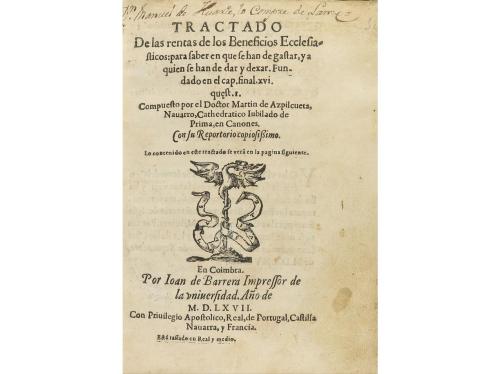 1567. LIBRO. (HUMANIDADES). TRACTADO DE LAS RENTAS DE LOS BENEFICIOS ECCLESIASTICOS: PARA SABER EN QUE SE HAN DE GASTAR, Y A QUIEN SE HAN DE DAR Y DEXAR. Coimbra: Ioan de Barrera Impressor, 1567. 8º mayor. 4 h. + 54 fol. + 8 h. Capitales xilográficas. Texto con apostillas marginales. Marca tipográfica en la portada. Antiguas anotaciones manuscritas en las hh. blancas del principio y el final y de propiedad de fecha 1762. Óxido puntual. Enc. en pergamino de época. CCPB 227884-7.