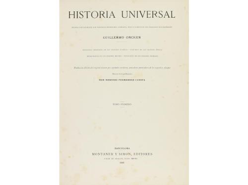 1881. LIBRO. (HISTORIA). HISTORIA UNIVERSAL. Trad. Nemesio Fernandez Cuesta. Barcelona: Montaner y Simon Editores, 1881. 10 vol. Folio. I: 300 + 416 + 215 p. II: 109 + 108 + 526 p. + 1 h. III: 540 + 328 p. + 1 h. IV: 822 p. + 1 h. V: 68 + 500 + 178 p. + 1 h. VI: 648 + 291 p. VII: 204 + 220 + 439 p. VIII: 340 p. + 280 + 453 p. + 1 h. IX: 120 +227 + 204 + 499 p. X: 560 + 172 + 270 p. + 1 h. Texto a dos columnas. Profus. ilustr. con figuras en el texto y lám. fuera del texto. Señal de óxido. 10 vol. enc. en media piel, lomeras rozadas.