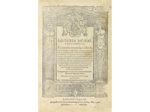 1590. LIBRO. (HUMANIDADES). HISTORIA MORAL Y PHILOSOPHICA, EN QUE SE TRATAN LAS VIDAS DE DOZE PHILOSOPHOS, Y PRINCIPES ANTIGUOS, Y SUS SENTENCIAS, Y AZAÑAS... Toledo: biuda de Iuan de la Plaça (sic.), 1590. Folio menor. 10 h. + 372 fol. + 7 h. Portada en orla xilográfica, cabeceras, capitales y culs-de-lampe xilográficos . Texto a dos columnas. Texto con aspotillas marginales. Portada remarginada, bien restaurada. Algunos cercos de humedad marginales, señal puntual de óxido. Enc. posterior en pasta española, nervios, doble tejuelo, lomera cuajada, cortes pintados, sin las guardas volantes. CCPB 306888-9. Palau 294393: "de interés desde el punto de vista moral y paremiológico" .