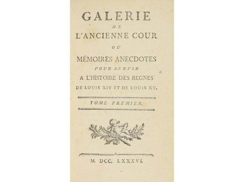 1786. LIBRO. (HISTORIA-FRANCIA). GALERIE DE L'ANCIENNE COUR OU MÉMOIRES ANECDOTES POUR SERVIR A L'HISTOIRE DES REGNES DE LUOIS XIV ET DE LOUIS XV. [Paris:] S. imp., 1786. 3 vol. en 8º menor. I: XXIV + 379 p. II: 2 h. + 476 p. III: 2 h. + 496 p. Tres vol. enc. en tela moderna, doble tejuelo. Primera edición. Obra ingeniosa y brillante, donde su autor no deja nada en el tintero y expone sus experiencias en la corte, sin esconder sus opiniones.