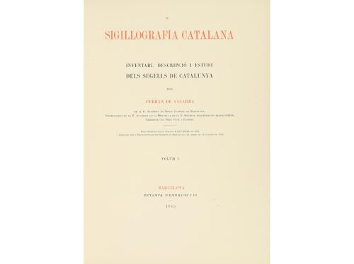 1915-1932. LIBRO. (HISTORIA-SIGILOGRAFÍA). SIGIL·LOGRAFIA CATALANA. INVENTARI, DESCRIPCIÓ I ESTUDI DELS SEGELLS DE CATALUNYA. Barcelona: Estampa d'Henrich, 1915-1932. 5 vol. en folio. Texto: I: XXVIII + 270 p.+ 2 h.+ 79 lám. II: XXXV + 435 p.+ 2 h. III: XXXIII + 540 p.+ 2 h. Láminas. II: Láms. de la LXXX a la CCXXII. III: láms. de CCXXII a la CCCCVI. Los tres primeros vol. enc. en cartoné edit., con lomera de tela y los dos de láminas en carpeta de cartoné edit. Todos en gris excepto el primero. Obra monumental y de referencia fundamental en su campo por la calidad del estudio y de precisión y documentación de las descripciones.