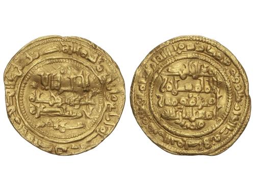 MONEDAS HISPANOÁRABES. Dinar. 458H. Abbad ibn Muhammad AL-MU´TADID. AL-ANDALUS. Anv.: Citando al-Zafir encima. Rev.: En nombre del imam Hisham, al-Mu´tadid / Billah. 3,42 grs. AU. ESCASA. V-924; Prieto 400c. EBC.