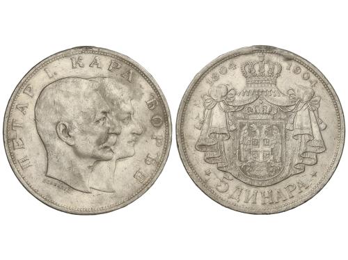 SERBIA. 5 Dinara. 1904. PETER I. 24,93 grs. AR. (Golpecitos, descolgada). KM-27. MBC.