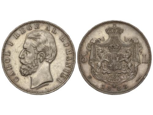 RUMANÍA. 5 Lei. 1883. 24,88 grs. AR. (Rayitas). Pátina. KM-17.1. MBC+.