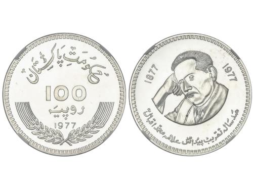 PAQUISTÁN. 100 Rupias. 1977. Encapsulada por NCV MS64 HAIRLINES (n. QBSOFD86SSUC). 20,33 grs. AR. Centenario Allama Mohamed Iqbal. (Rayitas). KM-48. SC. Tirada 3.000 piezas.