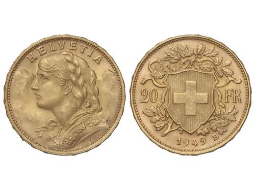 SUIZA. 20 Francs. 1949-B. BERNA. 6,45 grs. AU. Helvetia. Fr-499; KM-35.2. EBC+.