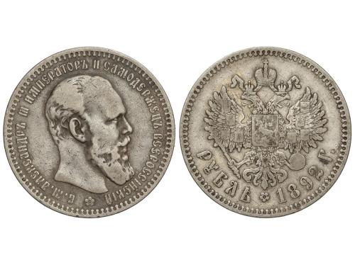 RUSIA. 1 Rouble. 1892. ALEXANDER III. 19,64 grs. AR. (Pequeños golpecitos). Y-46. MBC-.