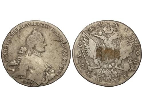 RUSIA. 1 Rouble. 1765-MMA. KATHERINE II. MOSCOW. 22,04 grs. AR. (Mancha de adhesivo en reverso). Pátina. C-67.1a. BC+.