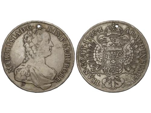 TRANSILVANIA. Thaler. 1755. MARIA THERESA. 27,66 grs. AR. (Perforación). Pátina. ESCASA. Dav-1145; KM-628. MBC.