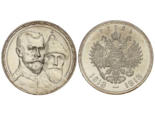 RUSIA. 1 Rouble. 1913. NICHOLAS II. 19,97 grs. AR. III Centenario dinastía Romanov. (Ínfimas rayitas de limpieza). Restos de brillo original en reverso. Y-70. EBC+/SC-.