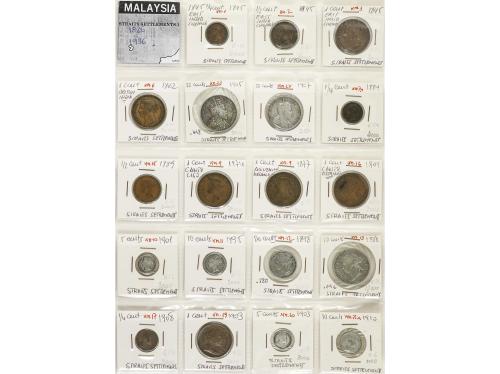 STRAITS SETTLEMENTS. Lote 30 monedas. 1845 a 1935. AR, AE. Contiene módulos de 1/4 a 50 Cent en plata y cobre. Diferentes reinados (Victoria a George V). A EXAMINAR. MBC- a EBC-.