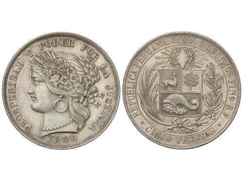 PERÚ. 5 Pesetas. 1880. LIMA. B.F. 24,92 grs. AR. Con punto después de la B debajo la corona. KM-201.2. EBC.