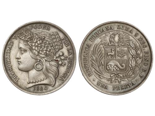 PERÚ. 1 Peseta. 1880. LIMA. BF. 5,09 grs. AR. Bonita pátina. KM-200.1. EBC.