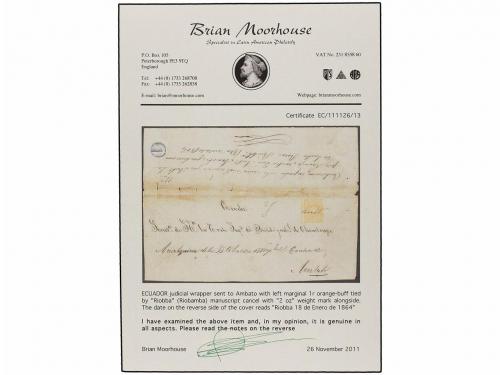 ECUADOR. 1865 (18 Enero). RÍO BAMBA a AMBATO. Plica Judicial circulada con sello de 1 real amarillo. Mat. manuscrito "Río bba". Al dorso fecha manuscrita del remitente 18 Enero 1864 , cuando debería poner "1865" error usual durante los primeros días del nuevo año. Mancha en el pliegue de la carta. MUY RARA utilizada durante los primeros días de uso del sello en Ecuador.