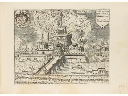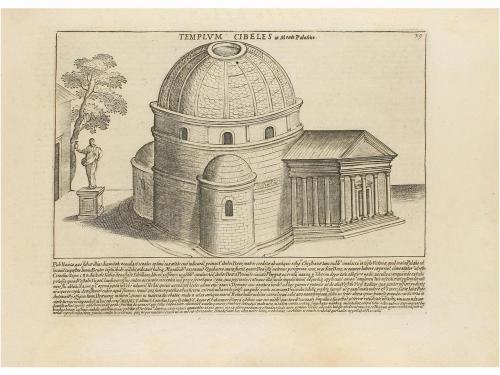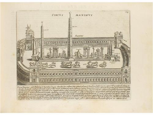 1641 ca. LIBRO. (ARTE-ROMA). LAURUS ROMANUS, IACUBUS:. ANTIQUAE URBIS SPLENDOR et eius admiranda aedificia. Roma: S. Imp., 1641 ca. Folio apaisado. 2 h. + 155 lám. (de un total de 166). Sin la portada. Lám. grabadas al aguafuerte numeradas y con texto en latín en la misma plancha, algunas de ellas fechadas en 1612, 1613 ó 1628. En la mayoría de láminas se presenta el texto trilingüe (italiano, alemán y francés) en verso y la lámina en recto. Contiene bellísimas imágenes de Roma y sus monumentos, así como el retrato del Duque Carlos Manuel I de Saboya. Enc. en media piel, puntas rozadas, nervios y tejuelo. Alguna antigua restauración marginal, cerco intenso en las últimas páginas, puntos de óxido, guarda con rasgadura. Anotaciones de anterior propietario.