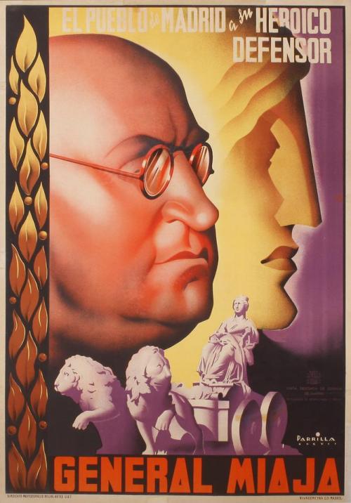 1937. CARTEL. PARRILLA:. EL PUEBLO DE MADRID A SU HERÓICO DEFENSOR GENERAL MIAJA. Litografía. 70 x 100 cm (27 x 39 in). Entelado, mínimas restauraciones marginales, A-.