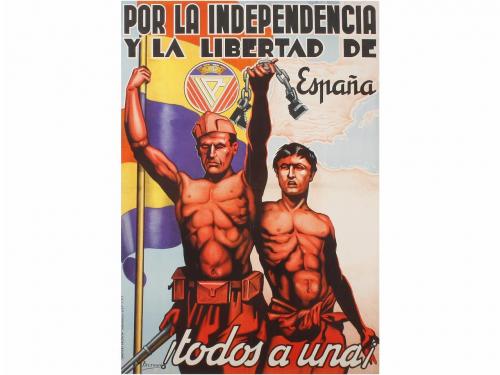 1937. CARTEL. (GUERRA CIVIL Y REPÚBLICA). BELTRAN:. POR LA INDEPENDENCIA Y LA LIBERTAD DE ESPAÑA ¡TODOS A UNA!. Valencia: Gráficas Valencia. Litografía. 100 x 70 cm (40 x 27 in). Entelado; antiguas señales de doblez, A-.