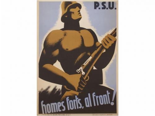 1937. CARTEL. (GUERRA CIVIL Y REPÚBLICA). P.S.U. HOMES FORTS, AL FRONT!. Barcelona: Gráficas Ultra; Ed.: Sindicat de Dibuixants Professionals UGT. Litografía. 68,5 x 99 cm (27 x 39 in). Antiguas señales de doblez, A -.