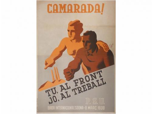1938. CARTEL. (GUERRA CIVIL Y REPÚBLICA). TORA:. CAMARADA! TU, AL FRONT. JO, AL TREBALL. DIADA INTERNACIONAL DE LA DONA. Barcelona: Gráfias Ultra, 8 Març 1938. Litografía. 144 x 100 cm. (56,7 x 39,2 in). Compuesto por 2 hojas. Entelado, ligeras restauraciones marginales, A -.