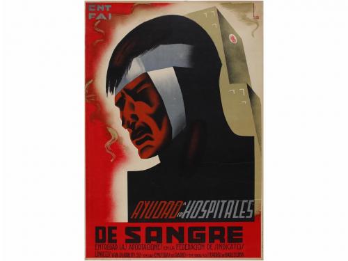 1937 ca. CARTEL. (GUERRA CIVIL Y REPÚBLICA). BADIA VILATO:. AYUDAD A LOS HOSPITALES DE SANGRE. Litografía. 76 x 110 cm (30 x 44 in). Entelado, pequeña reconstrucción en el margen izquierdo y algunas restauraciones periféricas, B.