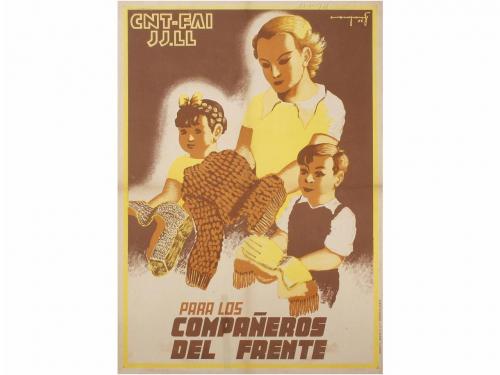 1938. CARTEL. (GUERRA CIVIL Y REPÚBLICA). COMPANYS:. PARA LOS COMPAÑEROS DEL FRENTE. Barcelona: Marti i Marti y Cia., 13 de Diciembre de 1938; Ed. CNT-FAI-JJLL. Litografía. 100 x 70 cm (39,2 x 27,5 in). Entelado; antiguas señales de doblez y restauración, A -.