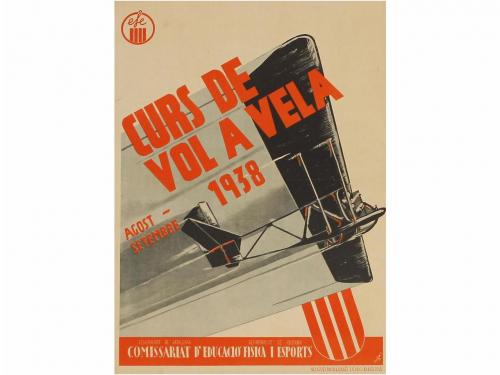1938. CARTEL. (AVIACION-GUERRA CIVIL). SANDREC:. CURS DE VOL A VELA. AGOST-SETEMBRE. Barcelona: Relleus Bada i Pagès, 1938. Generalitat de Catalunya, Comissariat d'Educació Física i Esports. Litografía. 62 x 44 cm (24,4 x 17,3 in). A-.