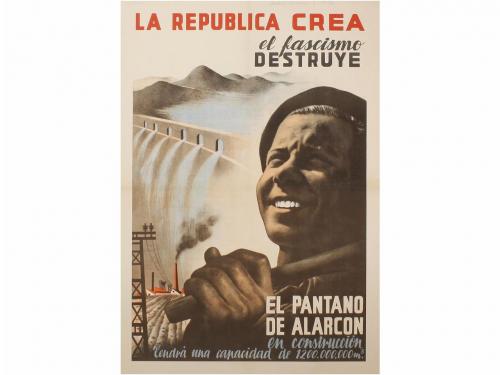 1937. CARTEL. (GUERRA CIVIL Y REPÚBLICA). LA REPUBLICA CREA, EL FASCISMO DESTRUYE. EL PANTANO DE ALARCÓN EN CONSTRUCCIÓN. Litografía. 81 x 56 cm (32 x 22 in). Entelado; antiguas señales de doblez, A-.