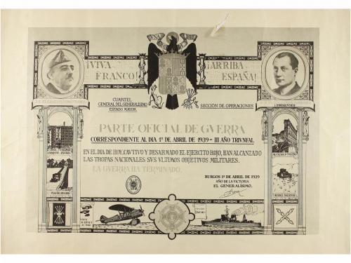 1939. CARTEL. (GUERRA CIVIL). PARTE OFICIAL DE GUERRA. LA GUERRA HA TERMINADO. Burgos 1 de Abril de 1939. Litografía. 26 x 38 cm (10,2 x 15 in). plancha; 34 x 46 cm papel (13,4 x 18,1 in). A-.