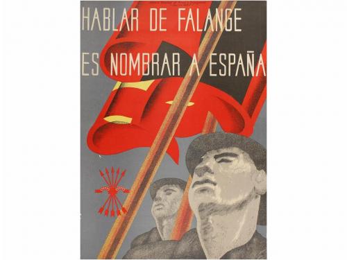 1940 ca. CARTEL. (GUERRA CIVIL). HABLAR DE FALANGE ES NOMBRAR A ESPAÑA. Cartel 37 x 51 cm. (14,3 x 20,3 in.) Editado por la Jefatura Nacional de Prensa y Propaganda. Litografia A.
