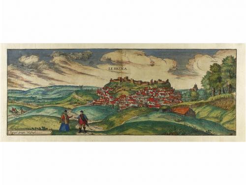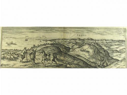 1560-1590 ca. GRABADO. (GRABADOS). HOEFNAGLE, GEORGIUS:. 2 GRABADOS DE VISTAS DE LEBRIJA Y VEJER. CIVITATES ORBIS TERRARUM. Grabados al cobre y uno coloreado de época, 18 x 45 cm y 17 x 49 cm. Ambos con el pliego central restaurado.