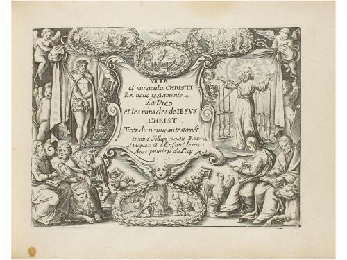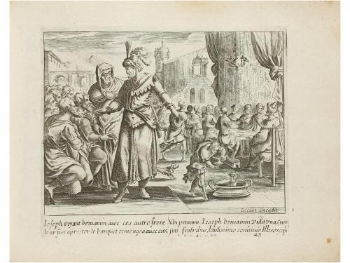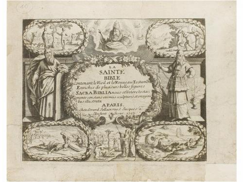 1703. GRABADO. (RELIGIÓN). JOLLAIN, GERARD:. LA SAINTE BIBLE contenant le vieil et le Nouveau Testament enrichie de plusieurs belles figures... Paris: Chez Gerard Jollain, 1703. 4º menor apaisado. 1 + 148 + 1 + 119 lám. numeradas. Dos portadas ilustr., la primera laminada. Bello conjunto de lám. calcográficas acompañadas de un pequeño texto en plancha y doble columna en francés y latín. Lám. 62 repetida. Algún punto de óxido en los márgenes. Cerco en el margen superior de las últimas lám. Enc. en plena piel, cantos rozados. Obra completa, rara así.