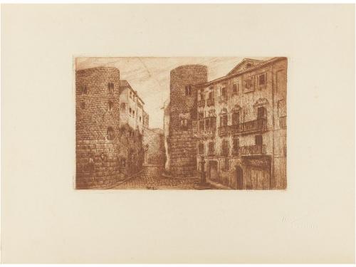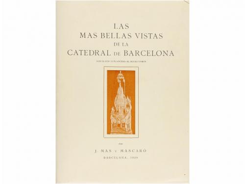 1929. GRABADO. (BARCELONA). MAS Y MASCARÓ, J.:. LAS MAS BELLAS VISTAS DE LA CATEDRAL DE BARCELONA. ALBUM. Barcelona: 4º menor. Álbum con 25 planchas grabadas al aguafuerte. 8 hojas de bibliografía en castellano, francés, inglés y alemán. Rústica impresa en caja de cartoné. Todas las planchas con firma del grabador estampada en seco. Tiraje de 125 ejemplares (manuscrito y firmado por el autor).