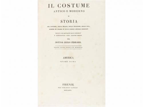 1826. LIBRO. (AMÉRICA). FERRARIO, GIUGLIO:. IL COSTUME ANTICO E MODERNO O STORIA DEL GOVERNO, DELLA MILIZIA, DELLA RELIGIONE, DELLE ARTI, SCIENZE ET USANZE DI TUTTI POPOLI ANTICHI E MODERNI. AMERICA. VOLUMEN PRIMO, TERZO y QUARTO. Firenze: Imp. Vicenzo Batelli, 1826. 3 vol. en 8º mayor. I: 330 p. y 36 lám. cromolitografiadas, una de ellas es un mapa plegado. III: 335 p., ilustr. con 39 láminas litográficas (la 35 numerada como 36) y un mapa plegado. IV: 272 p. y de la lámina 40 a 75 (de la 67 a 70 y 72 a 73 son dobles) + 5 suplementarias. Puntos de óxido y alguna hoja tostada. Se presentan tres vol. de los cuatro que completan la parte de América, es difícil hallar los cuatro juntos. Tres vol. enc. en media piel, tejuelo, una lomera con finos taladros, aunque la encuadernación no es igual en los tres. Ex-libris de anterior poseedor.