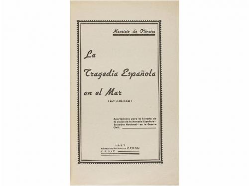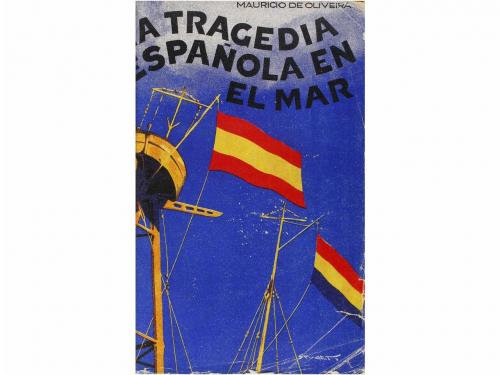 1937. LIBRO. (GUERRA CIVIL). OLIVEIRA, MAURICIO:. LA TRAGEDIA ESPAÑOLA EN EL MAR. Cádiz: Establecimiento Cerón, 1937. 8º mayor, cuatro tomos en un vol. 152 p. + 169 p. + 154 p. + 180 p. + 2 h. Ilustr. con numerosas lám. fuera del texto. Cuatro tomos enc. en un solo vol. en tela reciente, tejuelo, conserva la cubierta original anterior del primer tomo. Obra completa que relata la guerra civil española desde el punto de vista de la armada (escuadras nacionalista y gubernamental).
