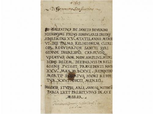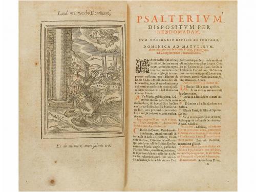 1604. LIBRO. (RELIGIÓN). BREVIARIUM ROMANUM, EX DECRETO SACROSANCTI CONCILII TRIDENTINI RESTITUTUM... Parisiis: Apud Societatem Typographicam Librorum Officii Ecclesiastici, 1604. 8º mayor. 40 h. + 900 p. + 135 p. Portada y texto a dos tintas y dos columnas. Dos grabados xilográficos. Abundantes anotaciones manuscritas de antiguo en las hojas de respeto del principio y el final. Enc. en piel, cortes dorados, con un hierro dorado con forma de óvalo que encierra la escena de la crucifixión en el plano anterior, en el posterior la escena reproducida es la anunciación.