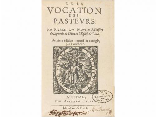 1618. LIBRO. (HUMANIDADES). MOULIN, PIERRE DU:. DE LA VOCATION DES PASTEURS. Sedan: Abraham Pacard, 1618. 8º. 10 h. + 324 p. + 6 h. Grabado tipográfico en la portada realizado por Gaultier, representa la escena del sacrificio de Isaac por parte de su padre Abraham. Sello húmedo de anterior poseedor y marcas de lápiz. Enc. en pergamino de época. Pierre Moulin fue un destacado estudioso educado en el protestantismo. Su prolífica obra va encaminada a señalar y denunciar los excesos de la iglesia católica, hecho que le puso en peligro en Francia y le hizo regresar a la protección de Inglaterra.
