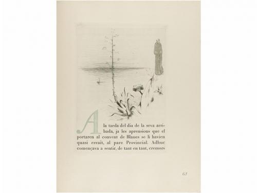 1935. LIBRO. (BIBLIOFILIA). RUYRA, JOAQUIM:. LES COSES BENIGNES. Barcelona: Rosa Vera, 1935. 4º menor. 91 p. + 1 h. Puntos de óxido. Ilustr. con aguafuertes de Jaume Pla. Edición numerada de 150 ejemplares en papel de hilo con firma del artista. En rama, carpeta de cartoné y petaca rozada.