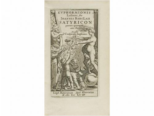 1655. LIBRO. (LITERATURA CLÁSICA). BARCLAII, IOANNIS:. EVPHORMIONIS LUSININI... SATIRICON partes quinque. Lugd. Batavorum: Apud Elzevirios, 1655. 8º menor. 6 h. + 568 p. Portada grabada. Cabeceras y capitales xilografiadas. Enc. en pleno pergamino, lomera rotulada. Buen ejemplar. Ex-libris de anterior poseedor.