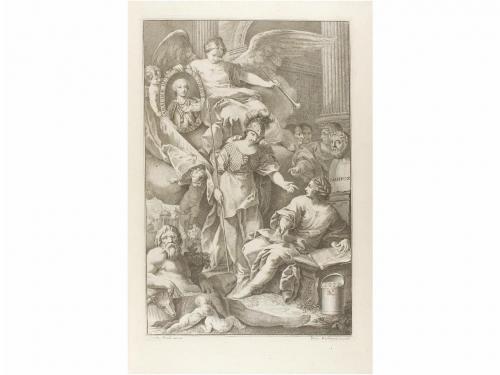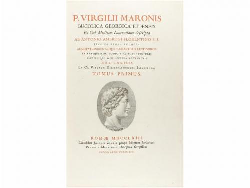 1763-1765. LIBRO. (LITERATURA CLÁSICA). VIRGILIUS MARO:. BUCOLICA GEORGICA ET AENEIS Ex-cod. Mediceo-Laurentiano descripta ab Antonio Ambrogi Florentino S. J. italico versu reddita adnotationibus atque variantibus lectionibus... 3 VOL. Roma: Joannes Zempel, 1763. 3 vol. en gran folio. I: 2 h. + Frontis + XCII + 1 h. + 211 p. II: Frontis + LX + Mapa + 336 p. III: Frontis + XXIV + 343 p. Cada vol. con portada a dos tintas y un retrato calcográfico. Bellamente ilustr. con cabeceras, capitales y culs-de-lampe calcográficas. Texto una y dos columnas en latín e italiano, amplios márgenes y p. limpias. 3 vol. enc. en pasta española rozada, hilos dorados en ambos planos, cantos, cejas; lomeras restauradas con importantes faltas. Anotación manuscrita y ex-libris de anterior poseedor.