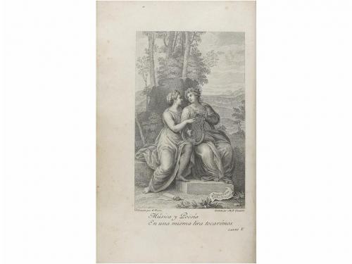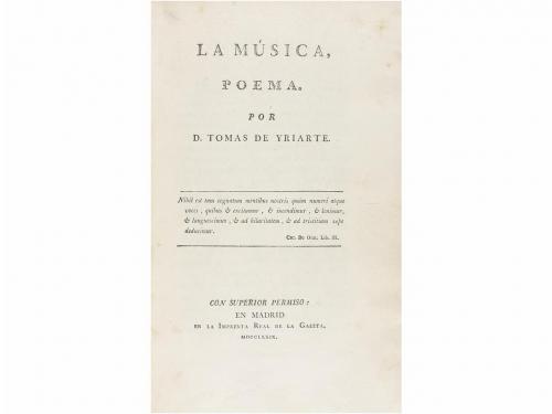1779. LIBRO. (LITERATURA). YRIARTE, TOMAS DE:. LA MÚSICA, POEMA. Madrid: Imp. Real de la Gazeta, 1779. 4º menor. 10 h. + 126 p. + XL p. + 1 h. Ilustr. con 6 lám. dibujadas por G. Ferro y grabadas por M. S. Carmona. Enc. en plena piel, ruedas doradas en ambos planos, tejuelo, cortes dorados. Rozadura en la parte superior de la lomera. Ligera señal de óxido. PRIMERA EDICIÓN de este poema dividido en cinco cantos, un verdadero ensayo sobre la música y su uso en la sociedad. CCPB 60745-2. Palau 121147.