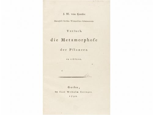 1790. LIBRO. (LITERATURA). GOETHE, JOHANN WOLFGANG VON:. VERSUCH DIE METAMORPHOSE DER PFLANZEN ZU ERKLÄREN. Carl Wilhelm Ettinger: Gotha, 1790. 8º mayor. 3 h. + 86 p. + 1 h. Páginas limpias y márgenes anchos. Enc. en media tela y puntas con papel al agua. Presentamos la PRIMERA EDICIÓN de esta obra, sin duda la más importante de Goethe en el ámbito científico. Autor polifacético, máximo exponente de la intelectualidad romántica. Obra capital de la biología botánica, en la que Goethe desarrolla la metamorfosis de las plantas a través de la morfología comparada, es considerada como precursora de las teorías darwinistas. Exlibris de anterior poseedor, sello seco; pequeñas anotaciones a lápiz de anterior poseedor en el interior de la cubierta anterior y portada.