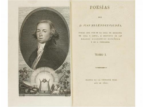 1820. LIBRO. (LITERATURA). MELENDEZ VALDÉS, JUAN:. POESÍAS DE... Madrid: Imp. Real, 1820. 4 vol. en 8º menor. I: Retrato + 1 h. + 358 p. II: 403 p. III: 341 p. IV: 335 p. Retrato dibujado por Rivelles y grabado por Blanco. 4 vol. enc. en pasta española, tejuelo y dorados, cortes pintados; puntas ligeramente rozadas. Sello seco. Palau 160180.